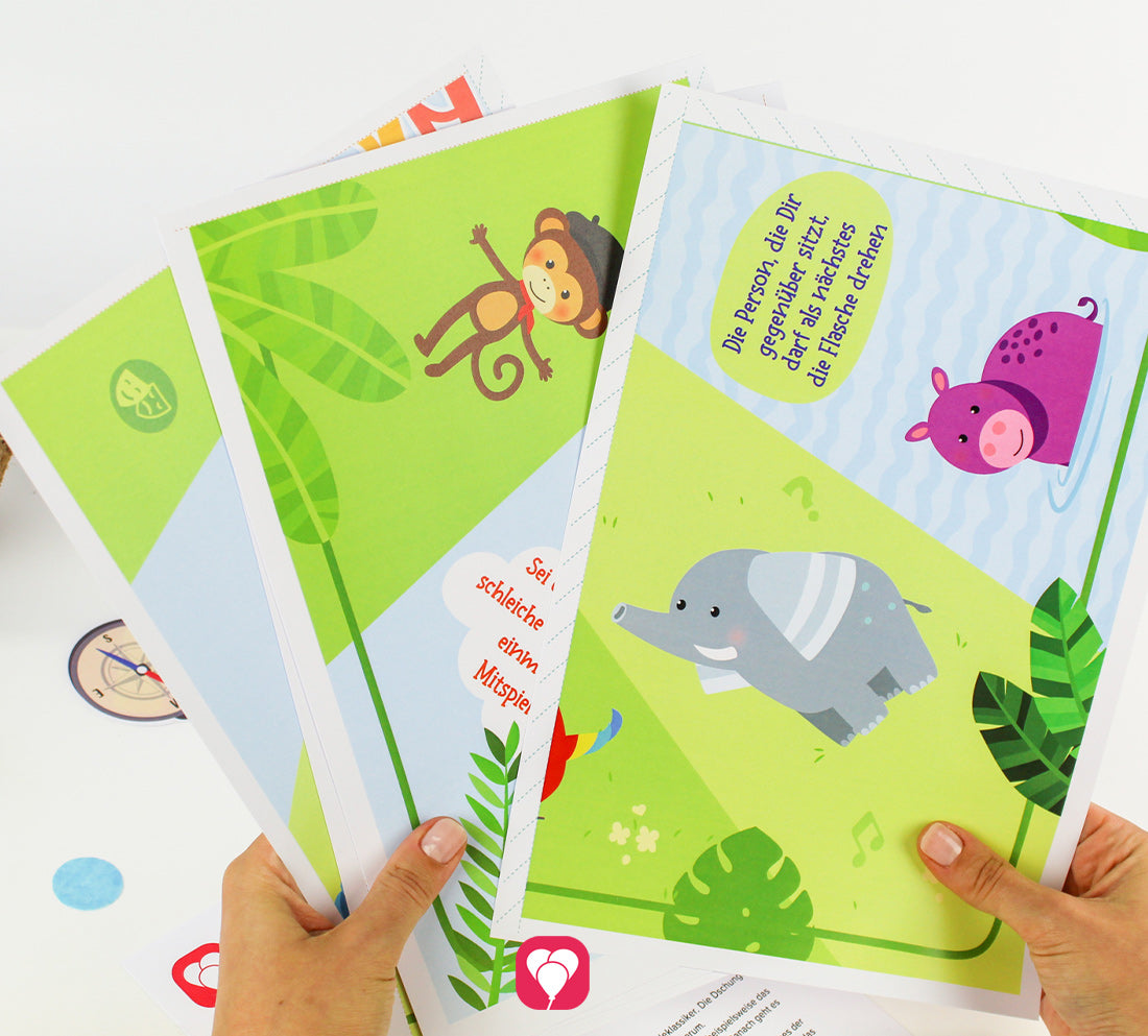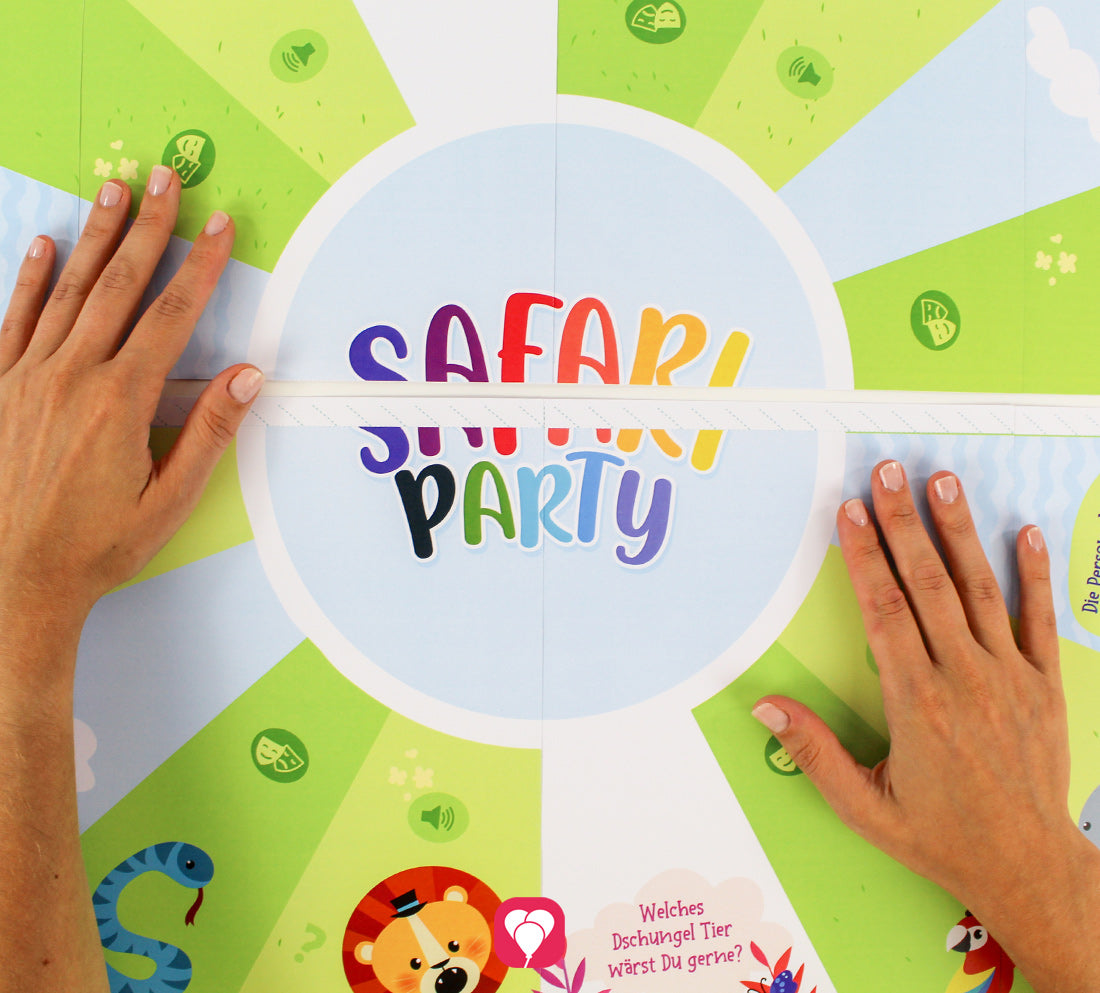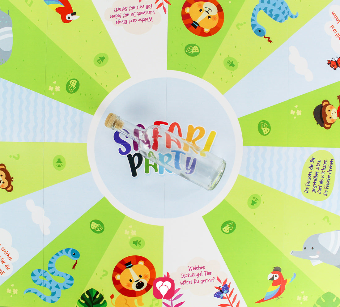 Mit dem Safari Flaschendrehen machst Du den Dschungel Geburtstag zum Highlight für kleine Entdecker! Das Spiel funktioniert wie der Spieleklassiker – aber mit vielen tierischen Aufgaben. Alle Spieler setzen sich rund um das bunte Spielfeld. In der Mitte des Spielfelds wird eine leere Flasche platziert, welche nacheinander von den Kindern gedreht wird. Das Feld auf dem der Deckel nun landet, enthält entweder eine Frage oder eine Aufgabe für das jeweilige Kind. So müssen die kleinen Entdecker beispielsweise Löwengebrüll imitieren oder sich in ein Krokodil verwandeln und um ihre Mitspieler kriechen. Das Party Spiel sorgt garantiert für tierischen Geburtstagsspaß und viele Lacher!