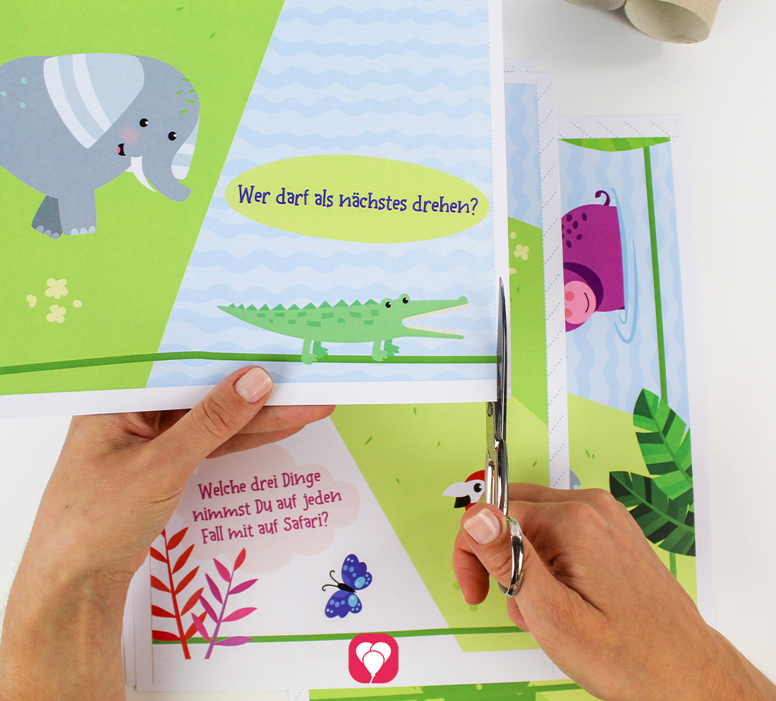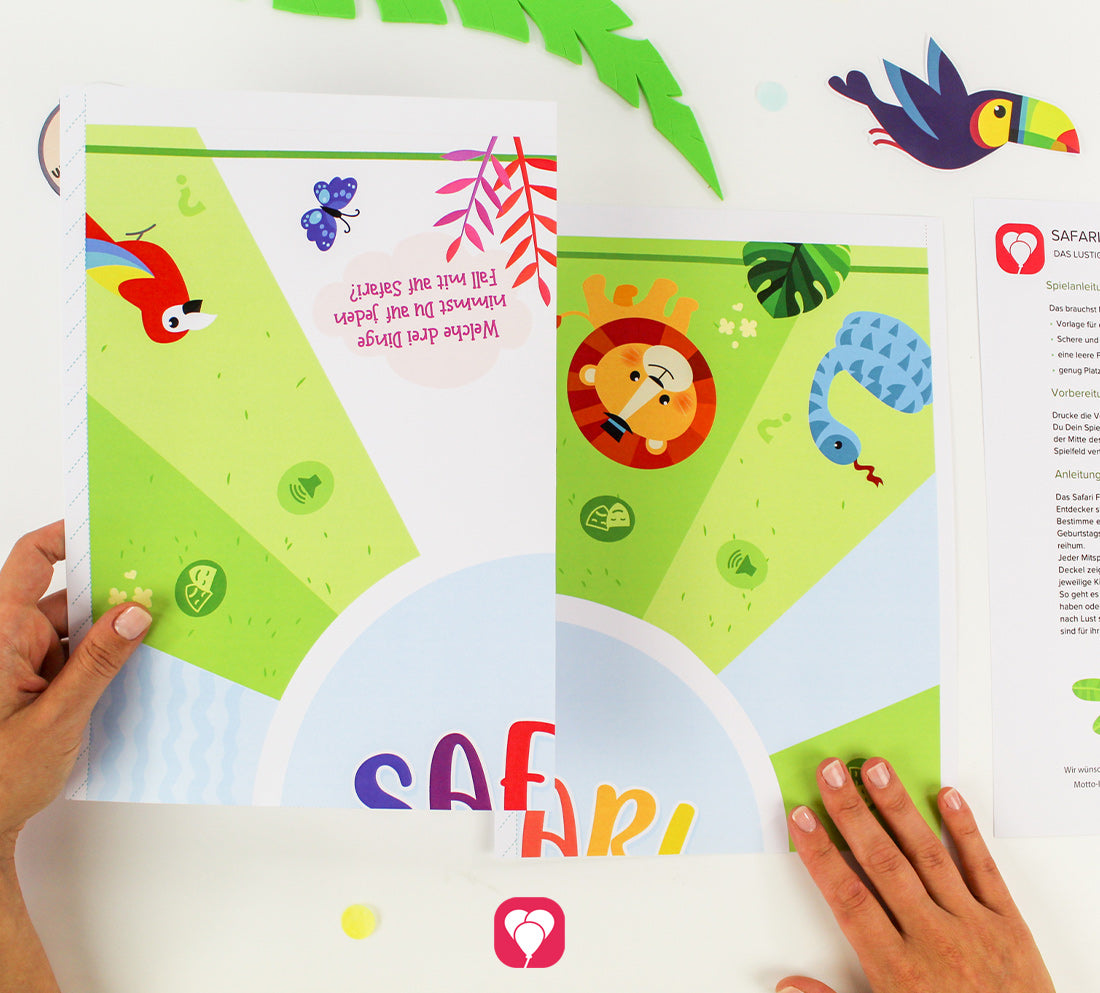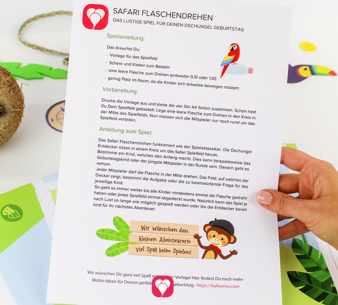 Das Safari Flaschendrehen zum Sofort Download enthält die Spielvorlage sowie eine Spielanleitung. Drucke die Vorlage aus und klebe die 8 DinA4 Seiten des Spielfelds zusammen. Platziere nun eine leere Flasche in der Mitte des Spielfelds und bestimme ein Kind, welches den Anfang macht. Natürlich kann das Spiel je nach Lust so lange wie möglich gespielt werden oder bis die Entdecker bereit sind für ihr nächstes Abenteuer. Achte nur darauf, dass die Kinder genug Platz haben um die Aufgaben ohne Probleme auszuführen.