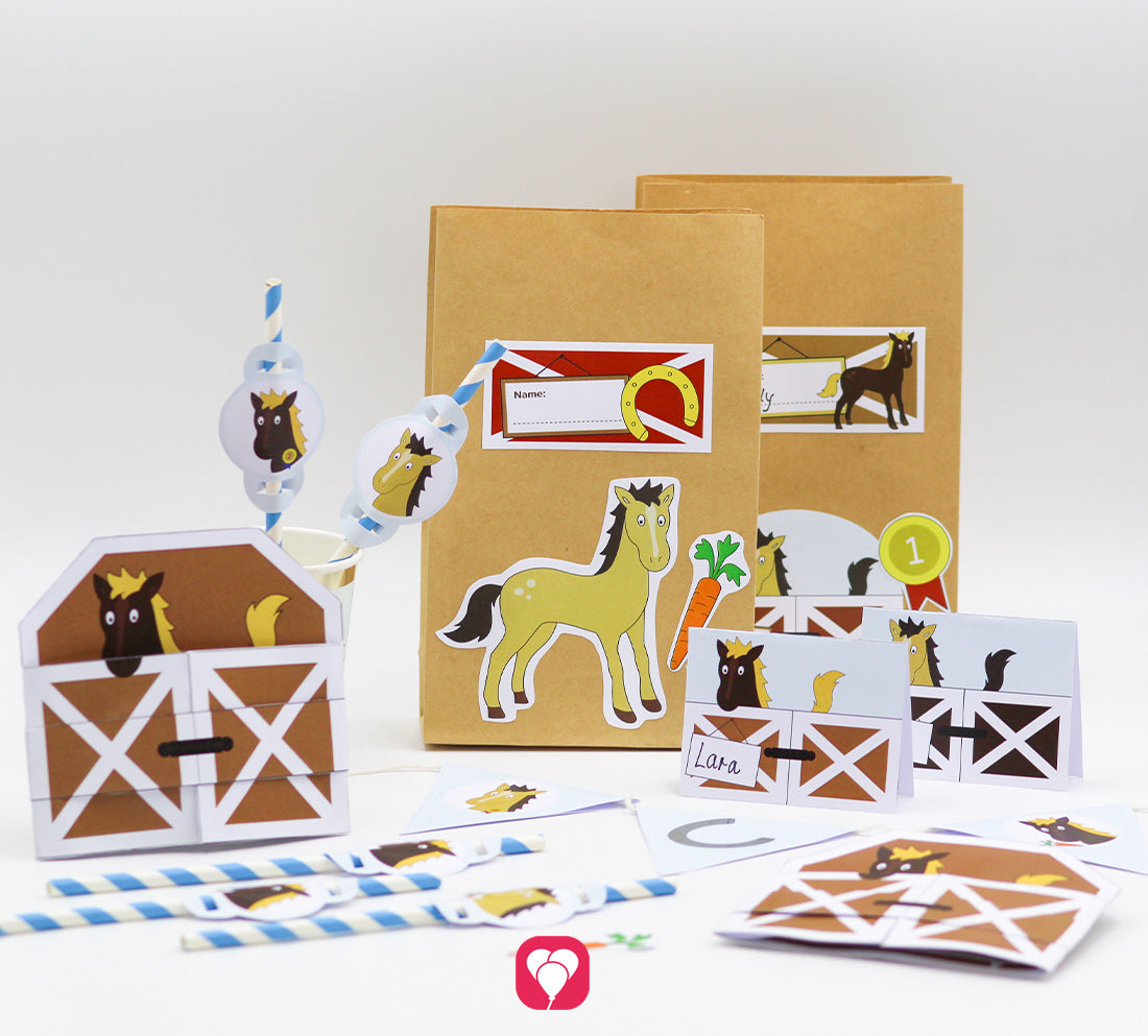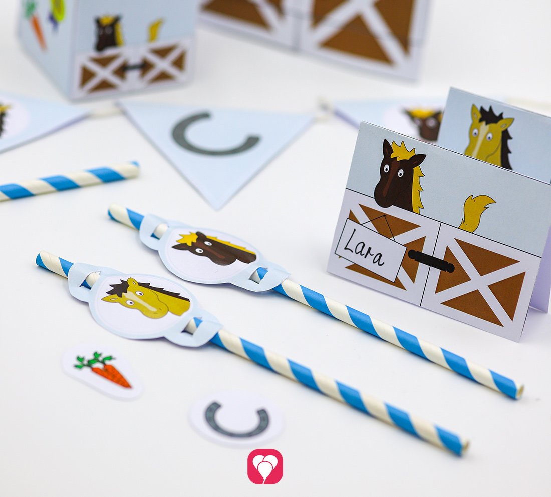Mit den Pferde Tischkarten und der Strohhalm Deko zauberst Du eine individuelle Deko für Deinen Pferde Geburtstag!