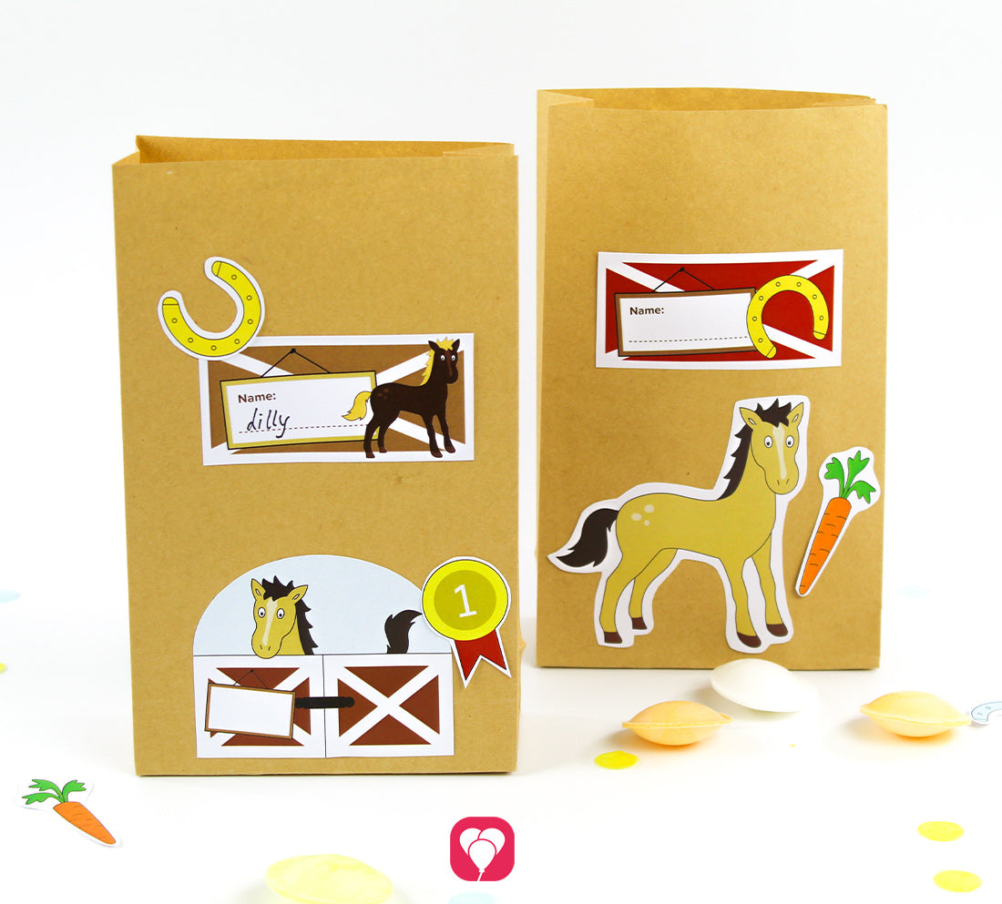 Nutze unsere Pferde Geschenkaufkleber um kreative Gastgeschenke für Deinen Kindergeburtstag rund ums Reiten zu basteln!